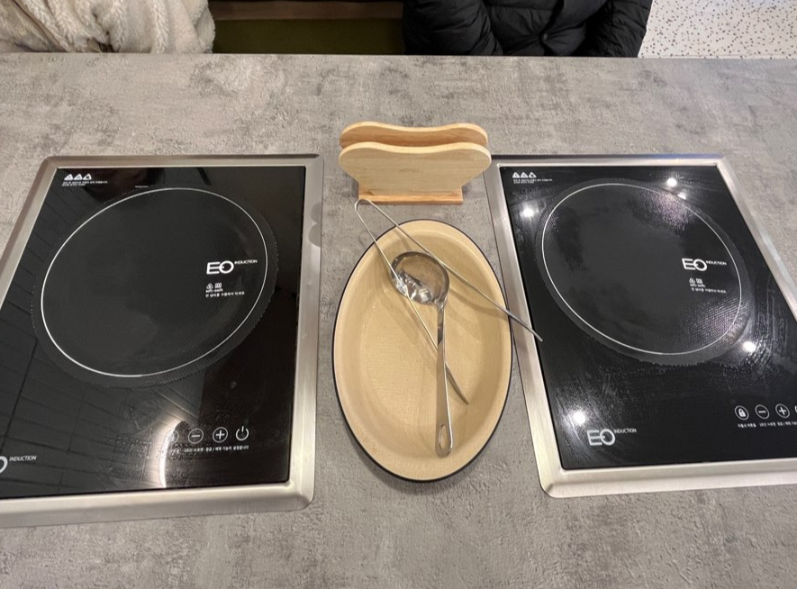 4인 테이블에 인덕션이 2개씩 설치되어 있어요. 하나는 샤브샤브 냄비, 하나는 편백찜을 올리게 됩니다. 샤브샤브 육수는 채소육수, 짬뽕 육수 두 종류가 나와요.