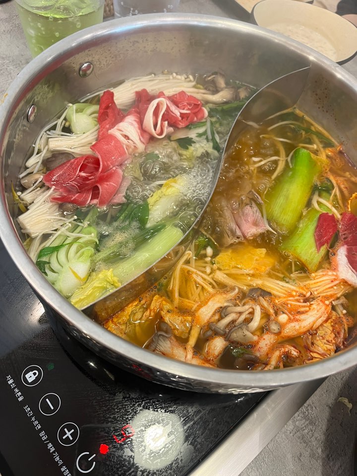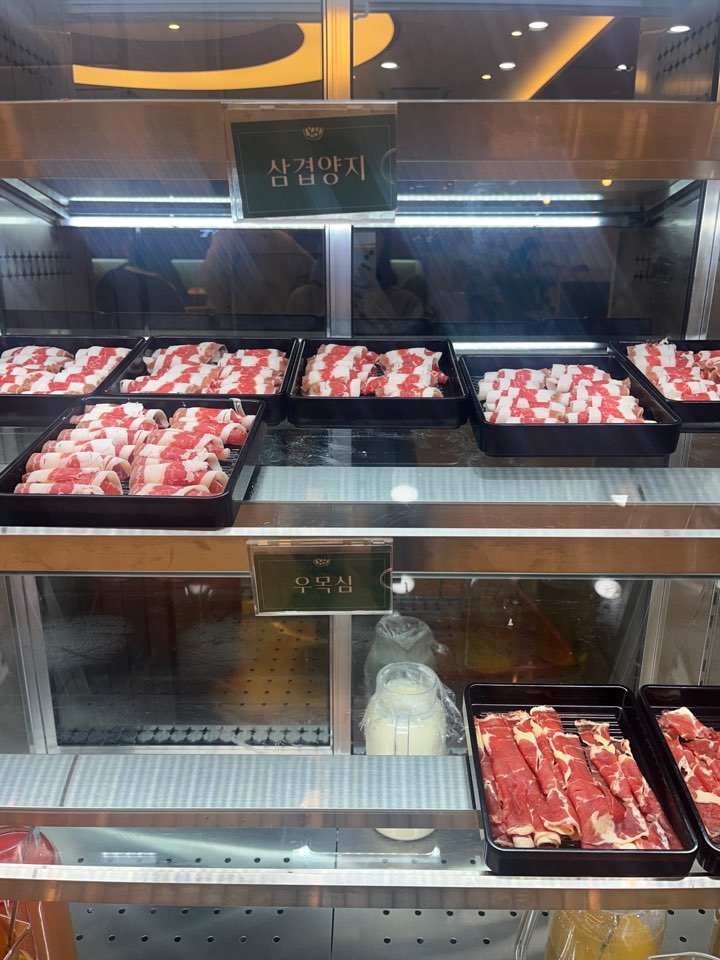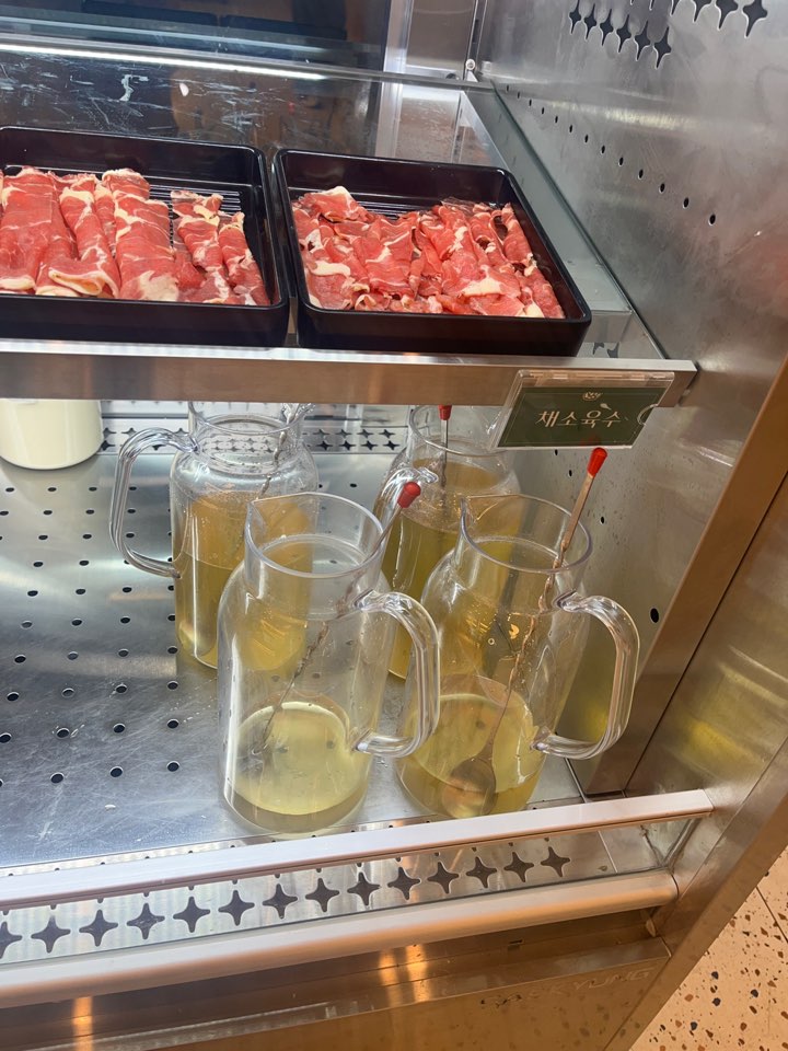 셀프 픽업존에 육수와 샤브샤브 고기가 세팅되어 있어서 원하는대로 가져다 먹으면 됩니다. 고기는 삼겹양지와 우목심 두 종류가 있어요. 의외로 우목심보다 삼겹양지가 맛있더라고요!
