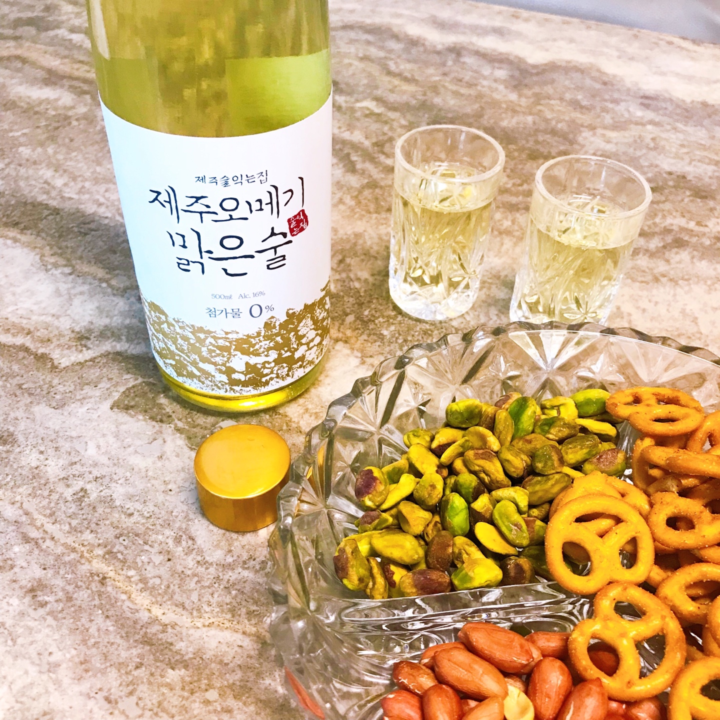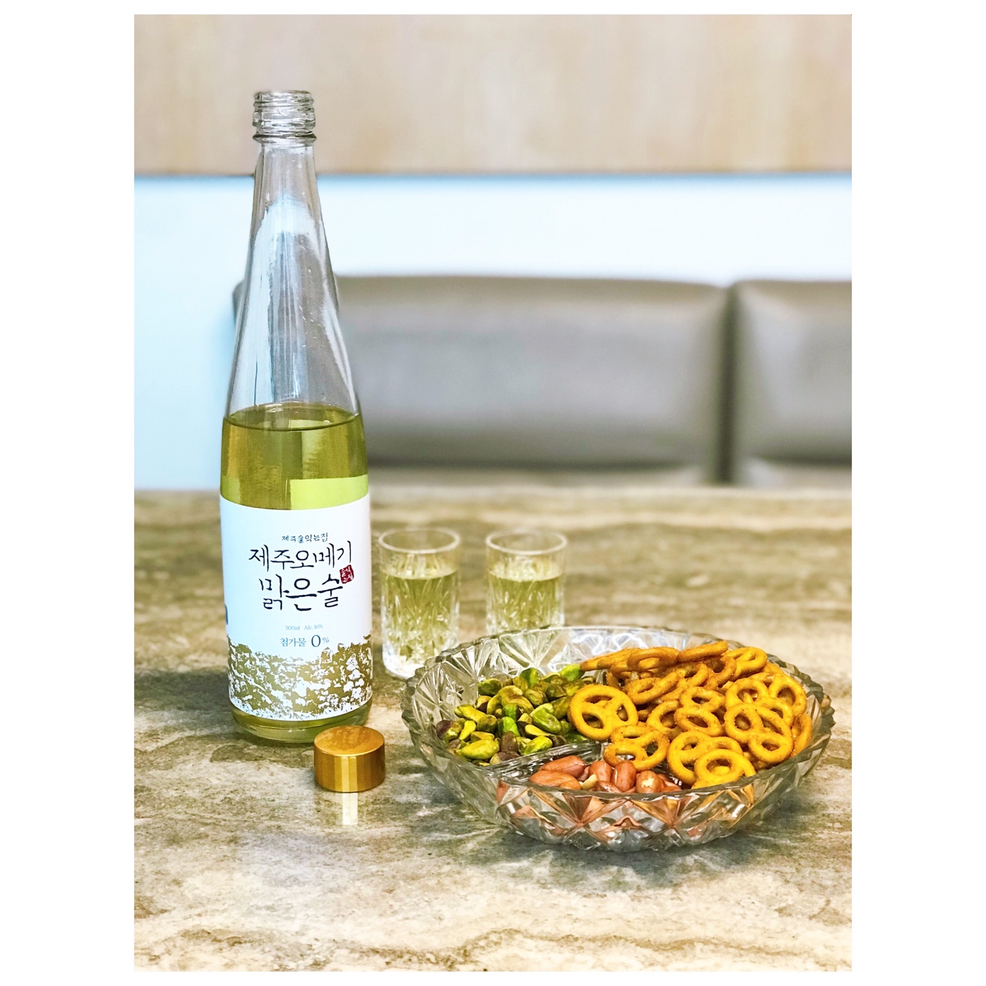 제주 오메기 맑은 술은 노란빛이 돌고 은은한 향을 가졌습니다. 늘씬한 모양의 유리병에 담겨 있어서 그립감도 좋고 술을 따르는 느낌도 좋았습니다. 노란빛의 술과 금빛 뚜껑이 고급스러운 느낌을 줍니다. 또한 라벨에 김희숙 명인의 자필 서명이 프린트되어 있는 것이 술에 대한 신뢰도와 가치를 더욱 높여주는 것 같습니다. 제주 오메기 맑은 술 사이트에 들어가서 제품 소개 설명을 보면 식전주로 마시는 것을 추천한다고 쓰여있습니다. 그런데 저는 견과류, 프레첼 같은 간단한 안주와 함께 디저트 술로 제주 오메기 맑은 술을 즐겨보았습니다.