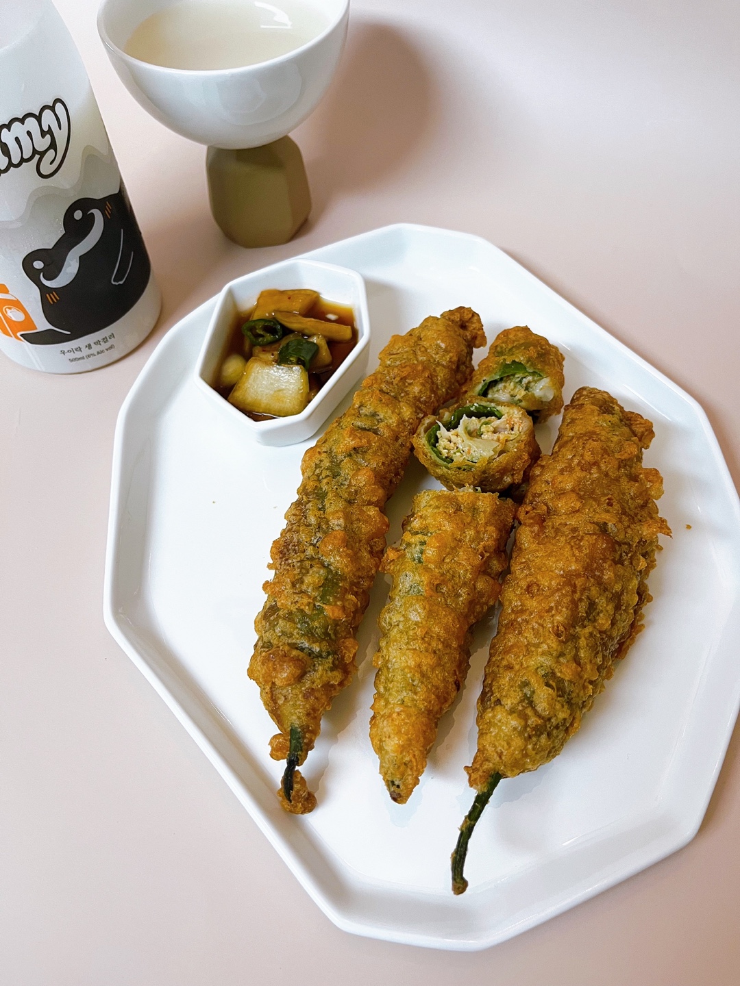 기름기 있는 고추튀김과 잘 어울리려면 탄산이 좀 들어가서 청량감이 강한 막걸리였으면 어땠을까 생각해봅니다.