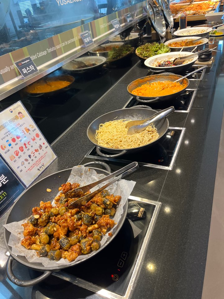 샐러드바에는 잡채, 샐러드류, 김치, 방울토마토, 바나나, 포도, 숏파스타, 유부초밥, 요거트가 있네요. 돈까스 뷔페라 돈까스만 여러 종류인 줄 알았는데 이렇게 다양한 메뉴가 포함이라니 너무 훌륭하지 않나요?