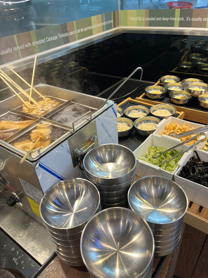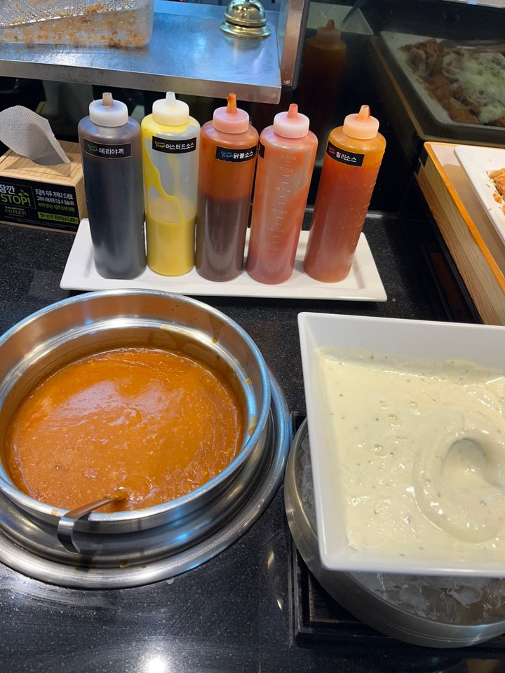 튀김류로는 돈까스, 치킨까스, 생선까스, 피자돈까스, 유린기, 고구마튀김, 김말이, 감자튀김이 있고 피자와 수프도 있습니다. 소스가 참 다양한데요. 데리야끼 소스, 머스터드 소스, 닭불소스, 케첩, 칠리소스, 기본 돈까스소스, 타르타르소스 이렇게 일곱 가지가 준비되어 있어 취향껏 뿌려 먹을 수 있습니다. 돈까스 전문점답게 돈까스가 정말 바삭하고 맛있었어요. 저는 생선까스가 제일 좋았네요.