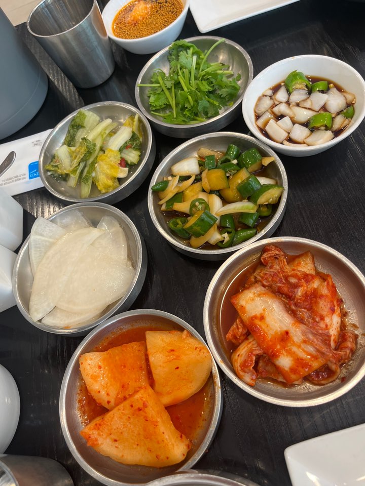 여기는 족발을 제일 많이 주문하는데 저희는 양곰탕, 양무침, 평양냉면을 주문했어요. 밑반찬이 일곱가지나 나와요. 모든 반찬이 정갈하고 맛있습니다. 특히 입맛을 확 돋궈주는 양파절임이 매콤새콤하고 좋았습니다.