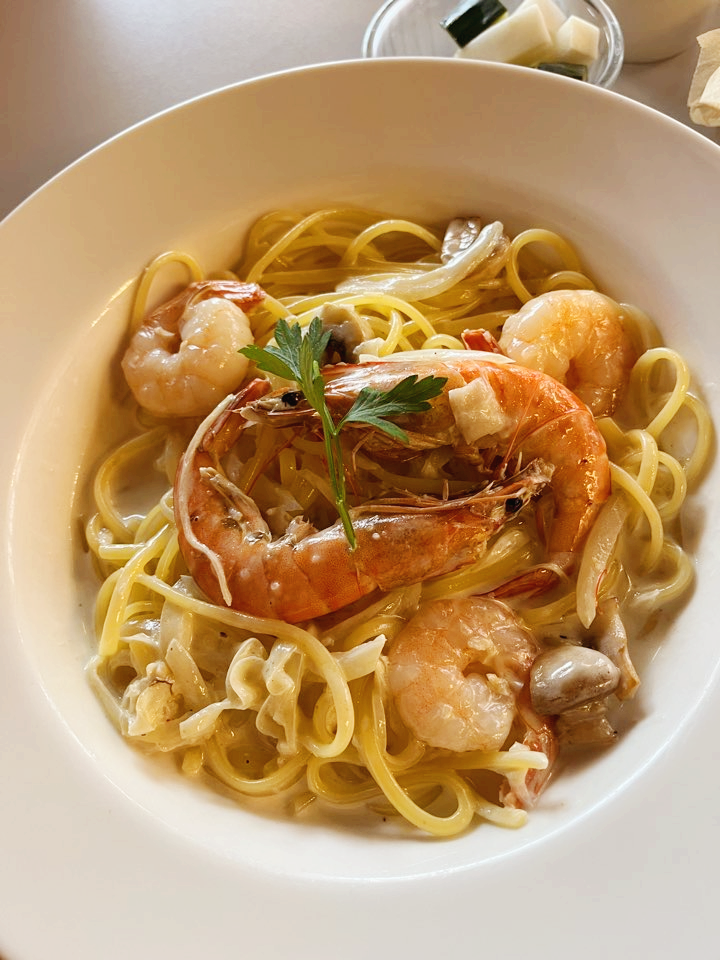 새우크림파스타(13,900 원)에는 커다란 새우 2마리와 작은 새우 3마리가 들어있었는데요. 심플하지만 깊은 맛이 나네요. 양도 적지 않습니다. 가격이 너무 합리적이네요!