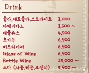 맥주는 호가든과 버드와이저가 있고 잔 와인은 레드, 화이트 두 종류가 있습니다. 바틀 주문도 가능한데 리스트는 방문해서 확인하셔야 해요. 네이버 예약 시 콜키지프리 쿠폰이 다운로드되니 다음에는 꼭 좋아하는 와인 챙겨서 방문해야겠습니다.
