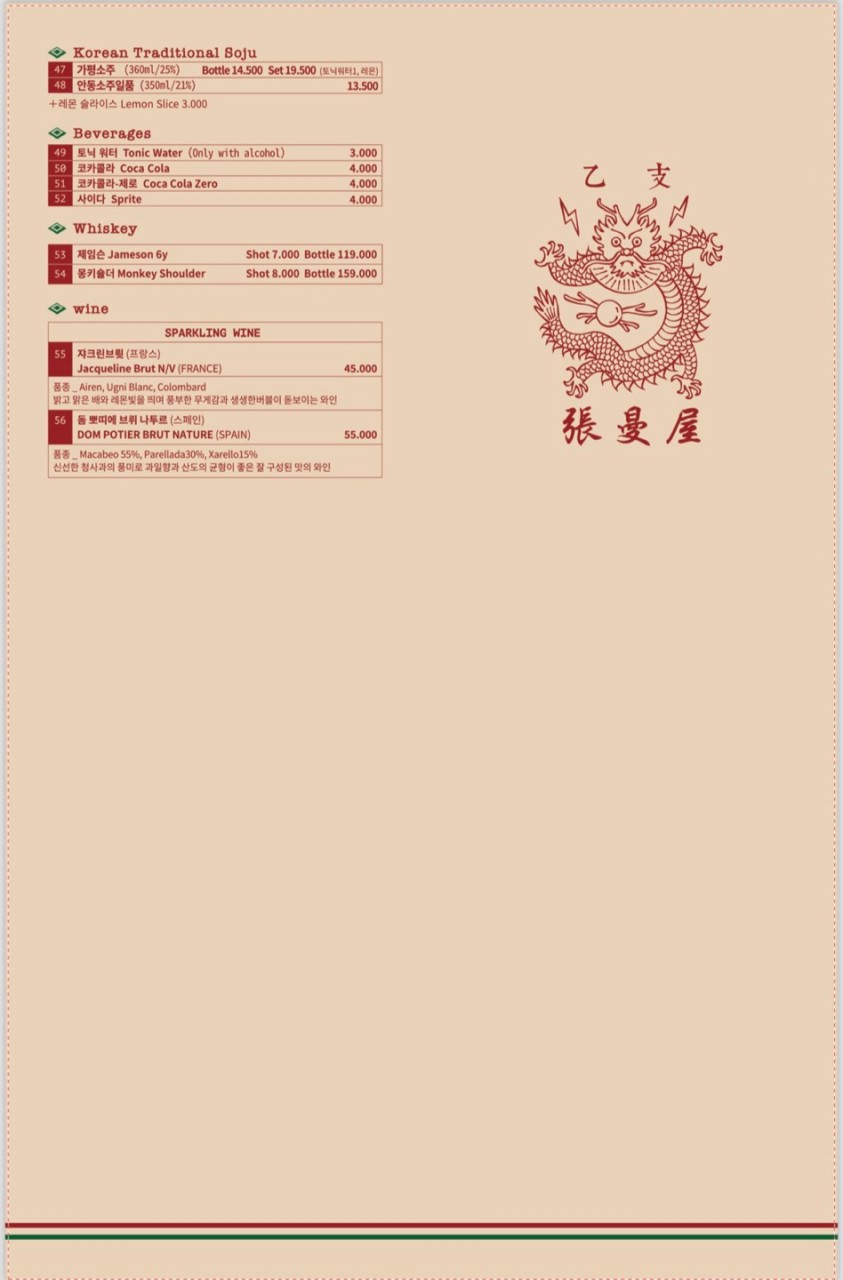 요리 메뉴는 15가지 정도 있고 주류는 생맥주, 연태고량주, 고량주, 칵테일, 한국소주, 위스키, 스파클링 와인이 있습니다. 메뉴가 정말 다양하죠?