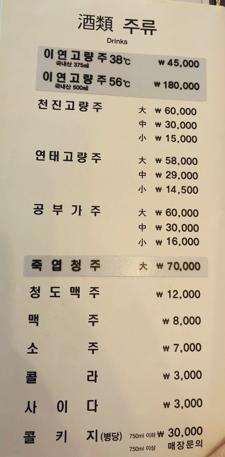 주류 메뉴판입니다. 이연 고량주는 38도(45,000원)와 56도(180,000원) 두 가지가 있어요. 그 외의 고량주로는 천진고량주, 연태고량주, 공부가주, 죽엽청주가 있습니다. 맥주는 청도(칭따오)맥주와 국산 맥주 카스가 있네요. 소주(참이슬, 처음처럼)도 있습니다.