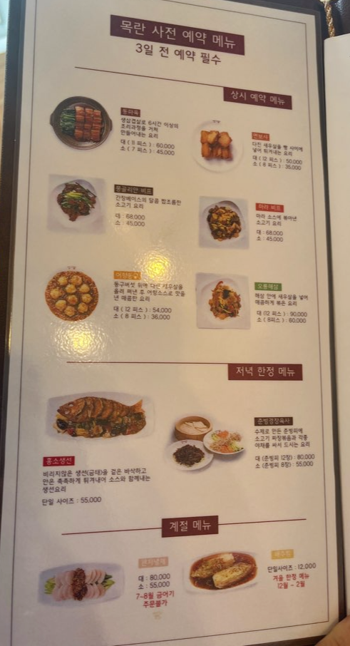 사전 예약 메뉴(동파육, 멘보샤, 경장육사 등)는 현장에서 주문이 불가합니다. 전화나 방문 예약하실 때 꼭 미리 주문하셔야해요! 사전 예약 메뉴는 아래에서 보여드릴게요.