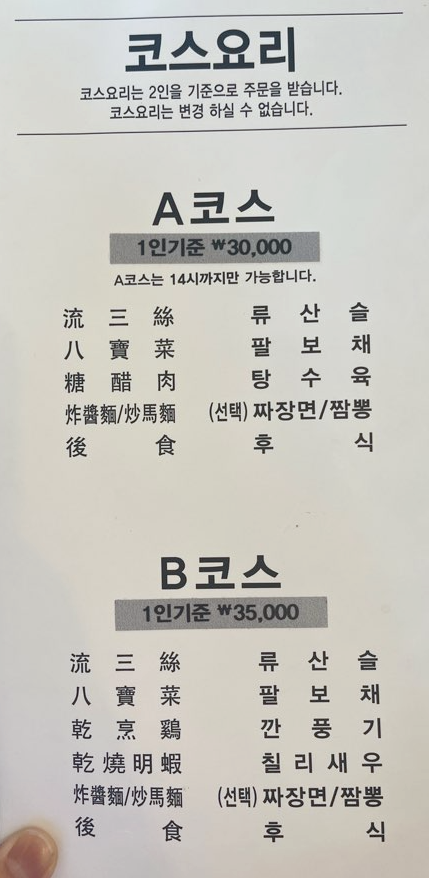 코스 메뉴는 2인 이상 주문 가능해요. 3만 원짜리 A코스에는 탕수육이, 3만 5천 원짜리 B코스에는 탕수육 대신 깐풍기와 칠리새우가 제공되는 것이 차이점입니다.