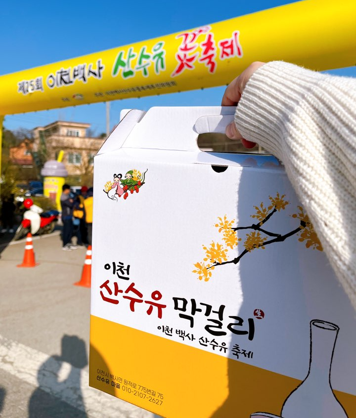 산수유 군락지 가는 방면으로 올라가다 보면 중간쯤에 이렇게 박스포장을 해서 판매 중인 유일한 매장이 있어요. 산수유 막걸리, 산수유 동동주, 황기 막걸리 3병이 세트로 들어있는 박스인데요. 다른 곳은 그냥 비닐봉지에 넣어주던데 이곳만 이렇게 박스 포장을 해줍니다.(3병 살 경우에만) 선물용으로 사가신다면 이곳에서 구매하시는 것이 좋겠죠? 저도 여기서 구매했답니다!