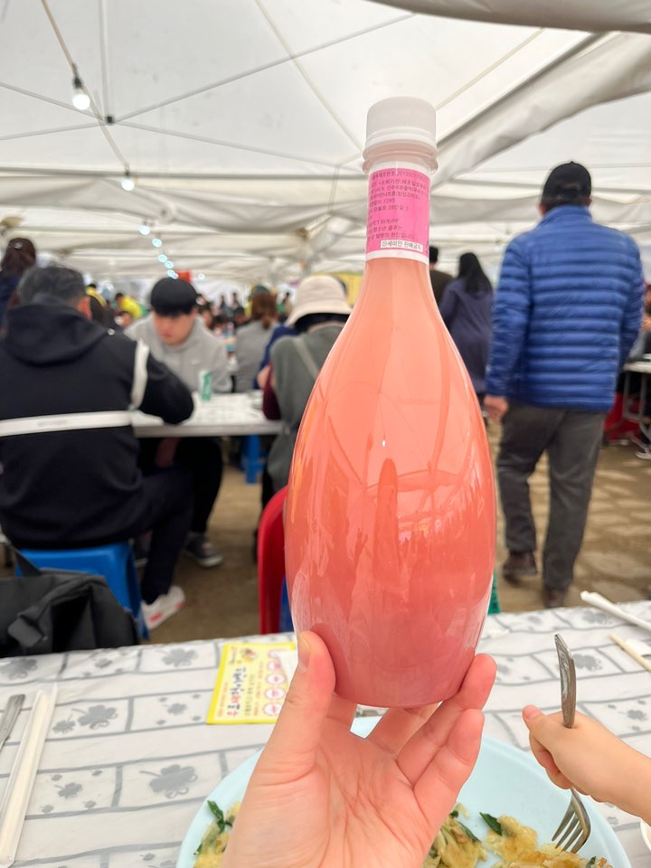 축제장 안에서 가장 큰 먹거리 부스에서 산수유 막걸리를 빈대떡과 함께 마셔보았습니다. 먹거리 부스가 여러군데 있는데 어디든 같은 산수유 막걸리를 팔고 있고 가격도 동일합니다. 예쁜 분홍빛 색감이 궁금함을 더해주네요.