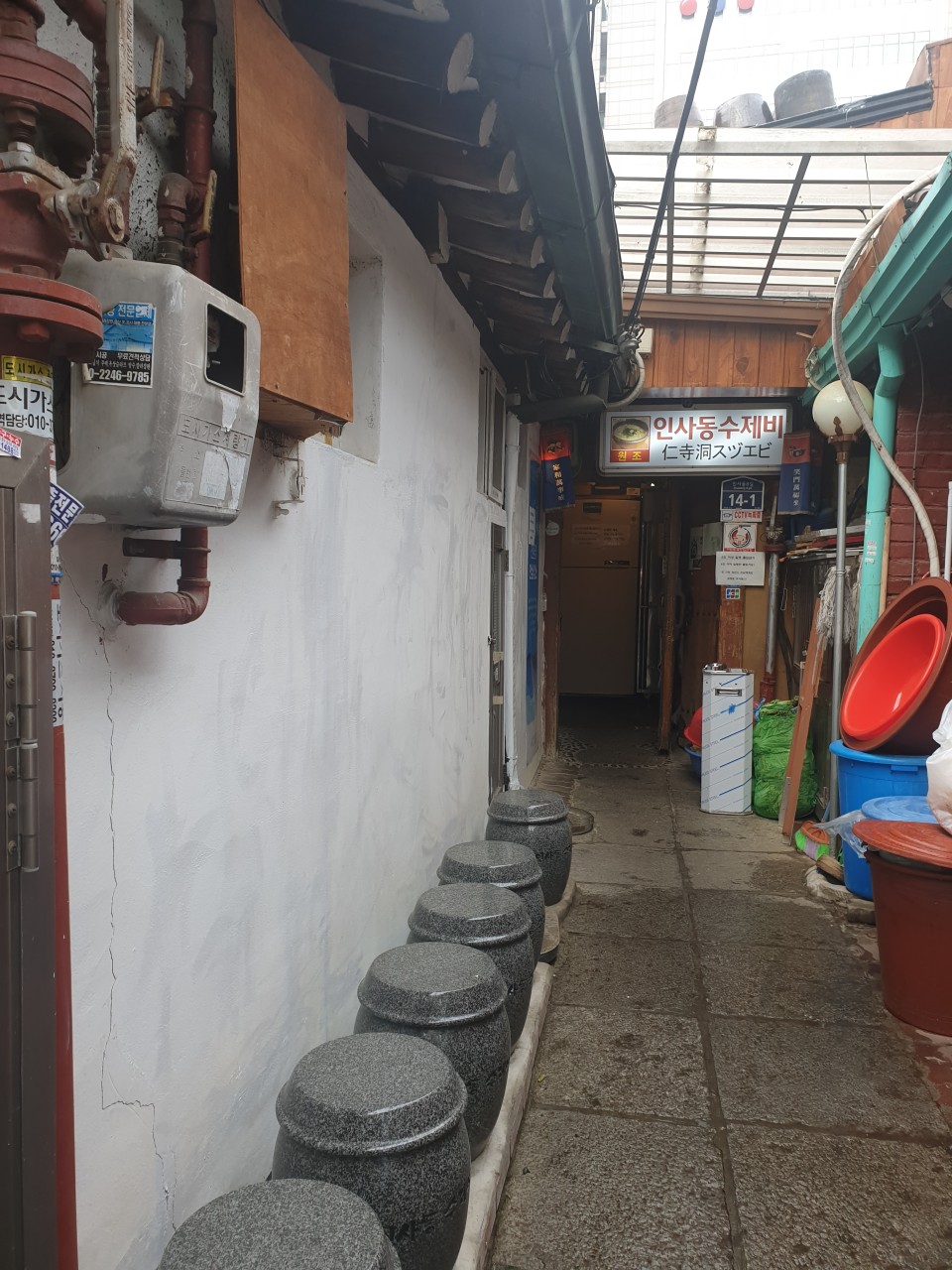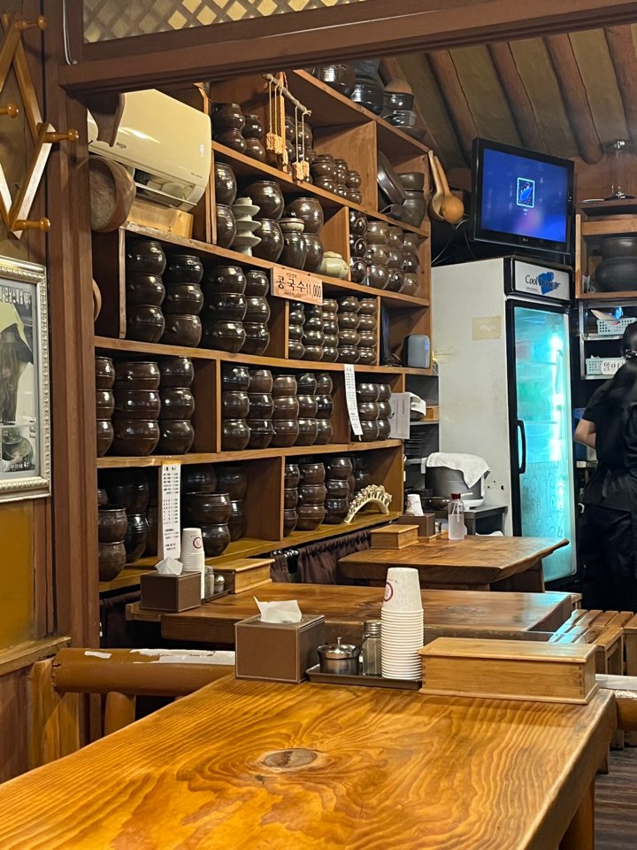 좁다란 인사동 골목 끝에 위치한 인사동 항아리 수제비 문을 열고 들어가면 우드톤의 식당 내부를 만나게 됩니다. 생각보다 좁아요. 한쪽 벽면을 가득 채운 옹기 그릇이 멋있게 느껴지네요. 밖이 너무 더웠는데 내부는 시원해서 좋았어요.