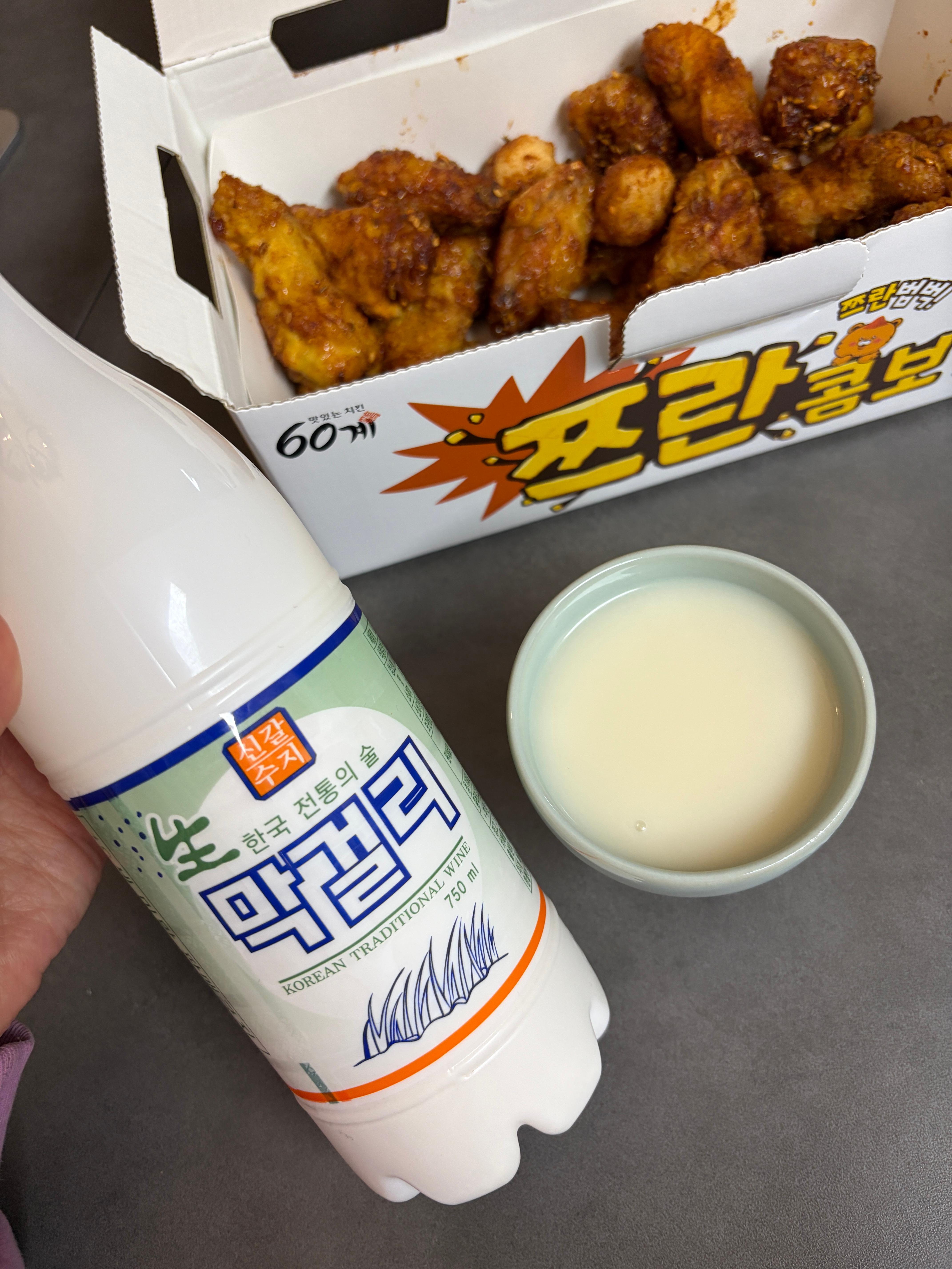 저는 4병이나 사왔기 때문에 여러번에 걸쳐서 다양한 안주들과 신갈수지 막걸리를 즐겨봤는데요. 한 번은 팔보채와 또 한 번은 60계치킨의 쯔란윙봉과 마셨어요.