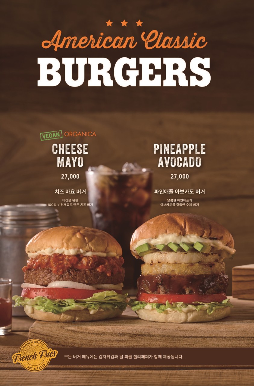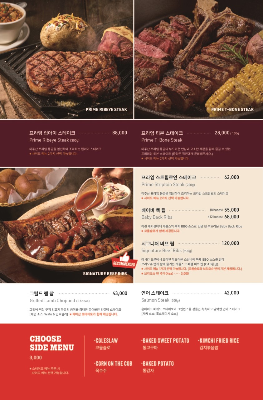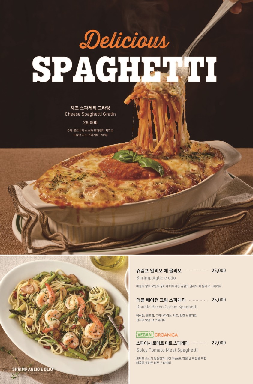 스테이크, 버거, 스파게티 메뉴입니다.