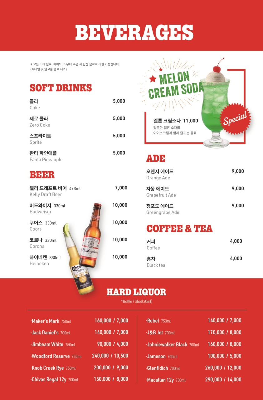 음료는 탄산과 에이드가 있으며 주류는 병맥주, 칵테일, 위스키(잔/보틀)가 있습니다. 와인 리스트도 있었는데 따로 촬영하지 못했네요. 가장 저렴한 와인은 4만 원대였어요.