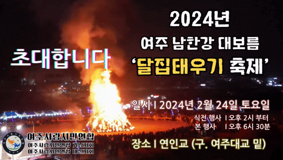 여주 정월대보름 달집태우기 축제는 쥐불놀이용 깡통만들기,연만들기와 함께 참여한 주민들이 한해의 계획과 소망을 적은 소원지를 작성해 달집에 미리 묶어 놓아 축제를 준비합니다. 각종 공연행사, 이벤트행사, 체험행사 등 한번 오신 방문객님이 다시 여주 정월대보름 달집태우기축제를 찾을 수 있도록 알차게 준비한다고 합니다.