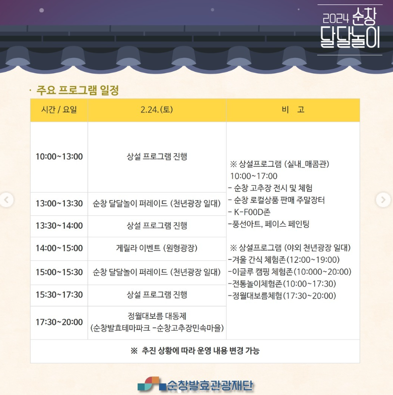 -민속놀이, 세시풍속,한복 및 전통의상, 복고문화, 전통차시음회, 전통음식 시식회, 가족소원쓰기, 단체줄넘기대회, 새끼꼬기, 죽서루등 만들기, 추억의 놀이, 떡 잇기 강강술래, 야간 횃불 기줄다리기