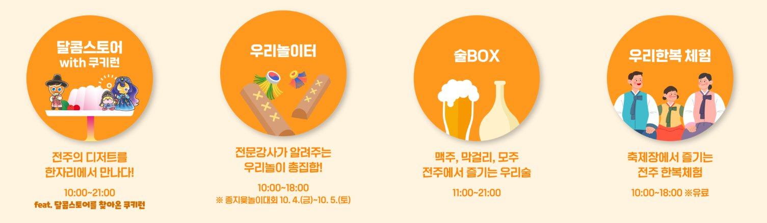 전주의 디저트를 한 자리에서 만날 수 있는 달콤 스토어, 전문강사가 알려주는 우리 놀이, 맥주, 막걸리, 모주 등 전주에서 즐기는 우리 술 box, 전주 한복 체험 등 다양한 콘텐츠가 준비되어 있네요.