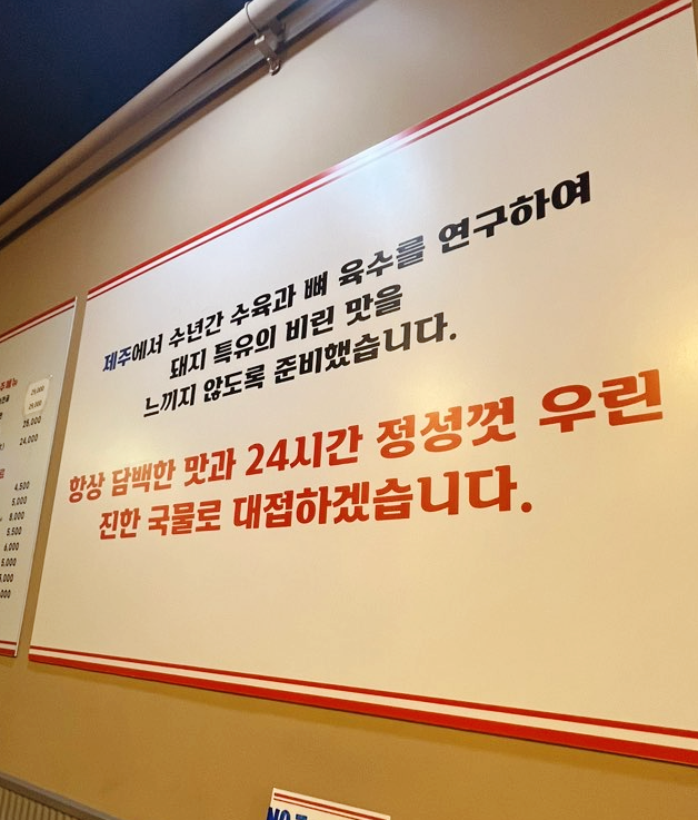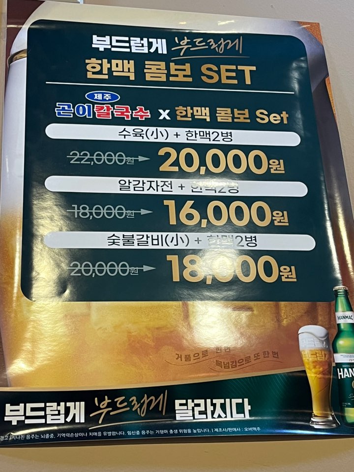제주에서 수년간 수육과 뼈 육수를 연구하여 메뉴를 개발하셨나봐요. 현재 한맥 콤보 세트도 할인가로 행사 중이네요. 회식이나 술자리 하러 오기 좋을 것 같습니다.
