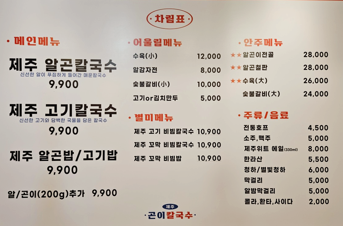 알과 곤이가 푸짐하게 들어간 알곤칼국수가 가장 메인 메뉴입니다. 그 외에 고기 칼국수, 수육, 알곤이 전골, 알곤 철판, 꼬막 비빔밥 등이 있어요.