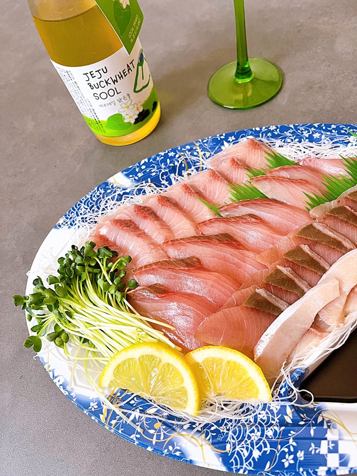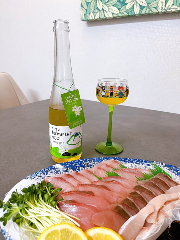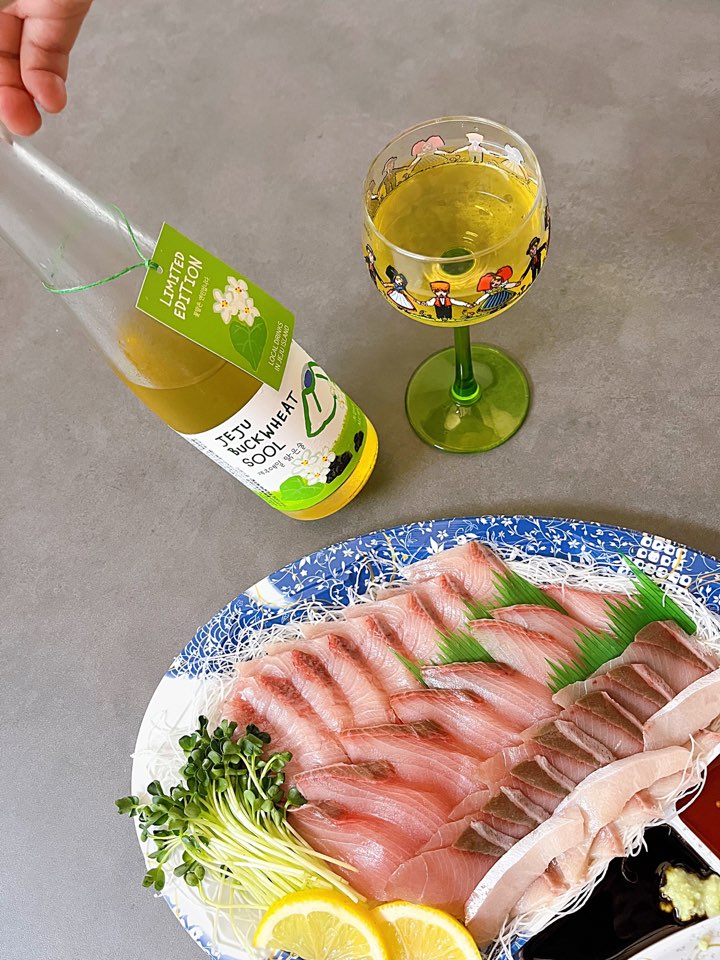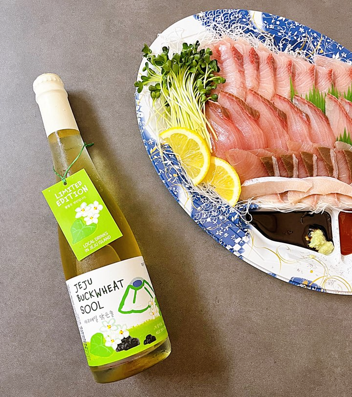 안녕하세요! 오늘은 '집에서 한 잔' 코너입니다. 이번에 소개할 술은 제주도 술인데요. 제주곶밭 양조장에서 야심 차게 내놓은 신상 한정판 약주인 제주 메밀 맑은술입니다. 제철 맞은 방어회와 함께 마셔보았습니다. 한 번 보실래요?