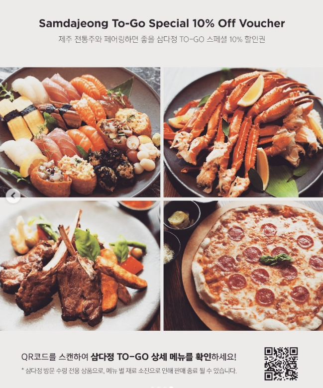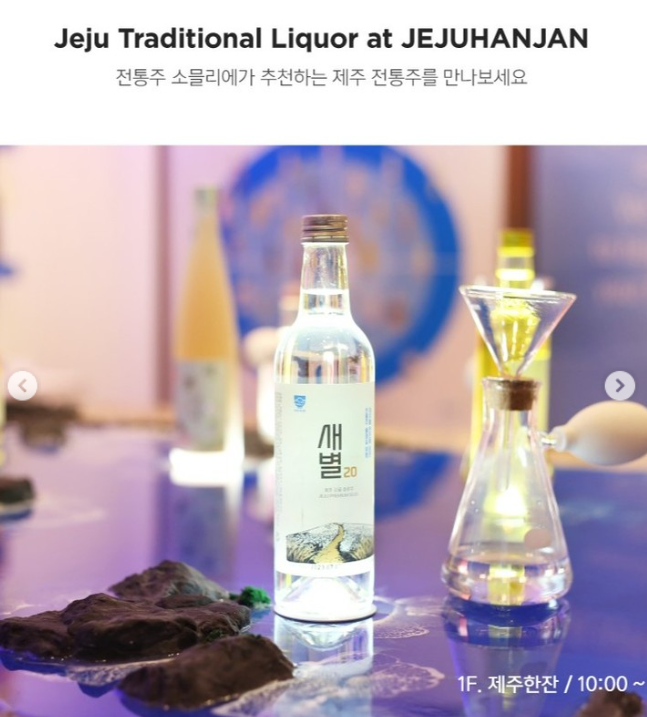 메종글래드 제주 로비 1층에는 제주 최초 전통주 통합 브랜드인 <제주한잔>이 입점해 있는데요. 제주 술레길 패키지를 이용하는 고객에게는 제주 한잔의 제주 전통주 이용권 1매와 함께 뷔페 레스토랑 <삼다정>의 TO-GO Special 10% 할인권 1매를 제공한다고 합니다.