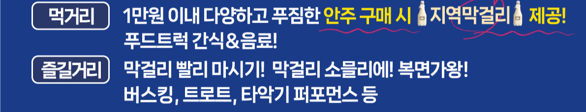 지역 업체 및 지역민들이 직접 개발하고 조리한 1만원 상당의 다양한 안주를 판매할 예정이며 안주 구매시 지역막걸리를 무한 제공한다고 해요.