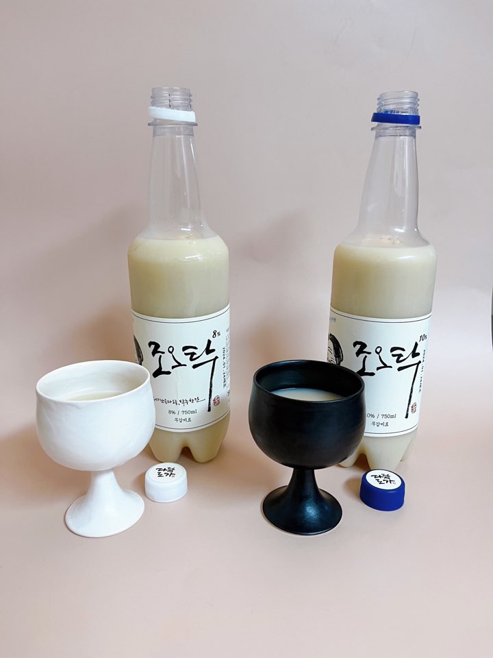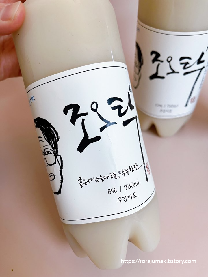 하얀 뚜껑이 8도, 파란 뚜껑이 10도입니다. 라벨에 그려진 사람 얼굴은 아마도 양조장 대표님이겠죠? 캘리그래피로 가독성 좋게 적힌 조오탁이라는 글자가 눈에 확 띕니다. 조오탁은 '좋은 사람들과 오늘, 탁주 한잔'의 줄임말인가 봐요. 라벨 보는 재미가 쏠쏠합니다.