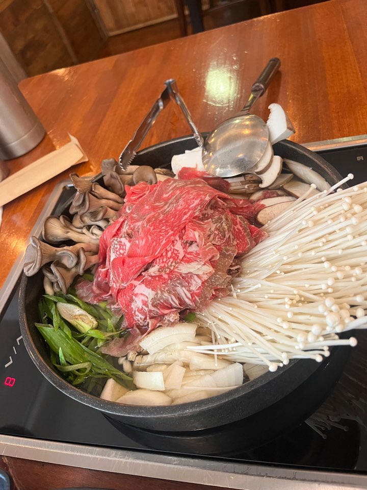 저희는 한우버섯전골 2인을 주문했습니다. 육수를 미리 끓여놓지 않고 바로 만들어서 주셔서 음식이 나오는데 시간이 조금 걸리는 편입니다만 고기가 얇아서 금방 끓어요. 한우라서 고기 육수가 아주 진했고 버섯도 넉넉히 들어있어서 아주 배부르게 먹었답니다.