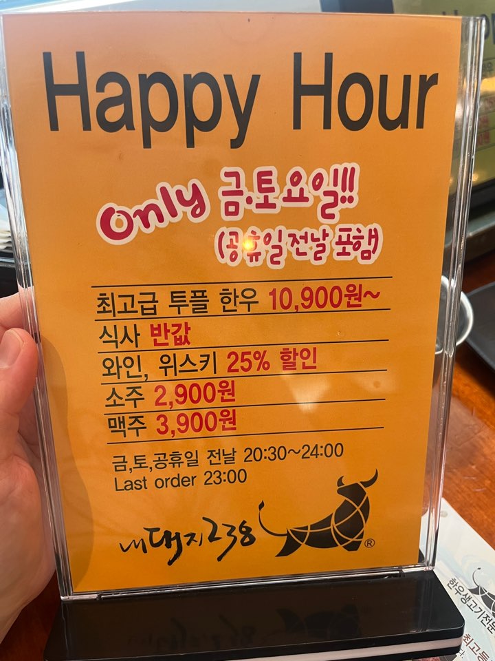 금요일과 토요일, 공휴일 전날에는 20시 30분부터 24시까지 해피아워로 운영되는데요. 이때는 투플 한우가 10900원, 식사는 반값, 와인과 위스키는 25% 할인, 소주 2900원, 맥주 3900원으로 판매된다고 해요. 긴 시간은 아니지만 짧고 굵게 즐길 수 있겠어요.