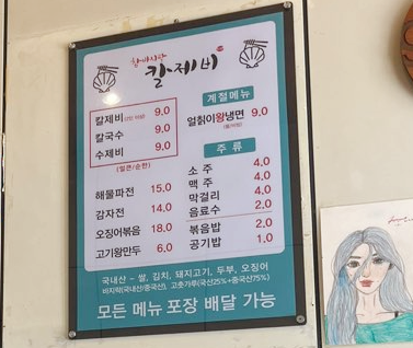 메뉴는 칼제비, 칼국수, 수제비, 얼칡이 왕냉면(계절메뉴), 해물파전, 감자전, 오징어볶음, 고기 왕만두가 있습니다. 칼제비는 2인 이상 주문이 가능하며 얼큰한 맛과 순한 맛 중에 선택할 수 있어요. 주류는 소주, 맥주, 막걸리가 있습니다.