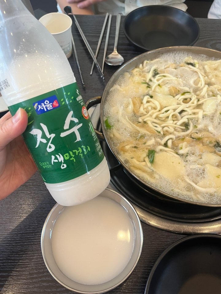 저희는 칼제비(순한 맛) 2인, 해물파전을 주문했습니다. 해물파전을 시켰으니 막걸리도 빼먹을 수 없죠! 막걸리는 장수 생막걸리입니다.