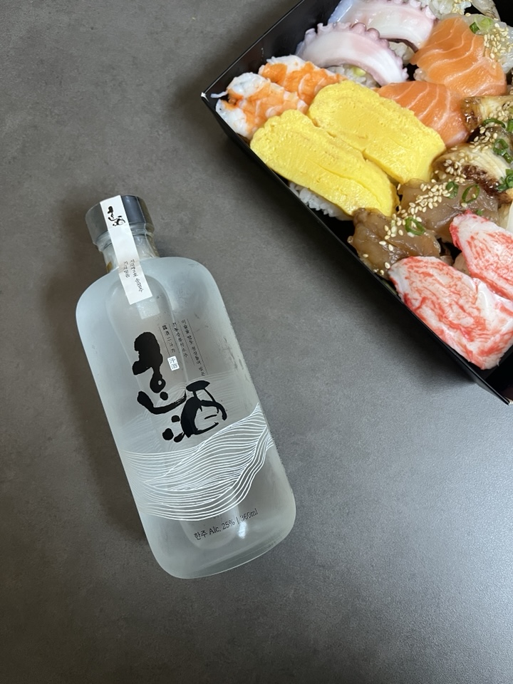 마트에 갔다가 초밥이 세일을 하길래 집어왔습니다. 초밥에는 사케나 청주가 어울린다고 하지만 25도 정도의 증류주도 꽤 잘 어울려요! 한주는 100% 국내산 쌀과 밀 누룩을 사용하여 만들어지는 술인만큼 쌀 특유의 달고 부드러운 맛이 아주 좋습니다. 저는 25도짜리 초록병 소주는 못마시지만 25도짜리 증류주는 알콜감이 세지 않고 마무리가 깔끔하고 부드러워서 너무 잘 마셔지더라고요.