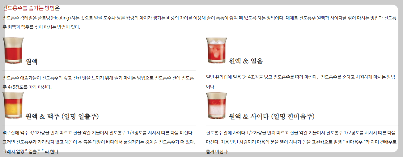 오늘은 예쁜 색감과 뜨거운 맛을 가진 진도 홍주를 소개해 보았습니다. 다양한 음용법 알려드렸으니 기호에 맞게 드셔보세요! 저는 다음에도 유익한 전통주 정보로 돌아오겠습니다. 감사합니다.