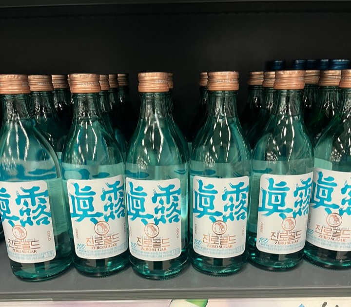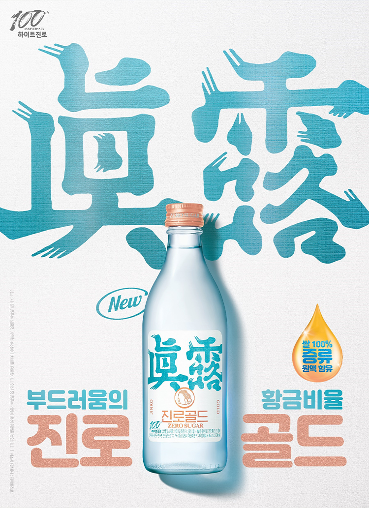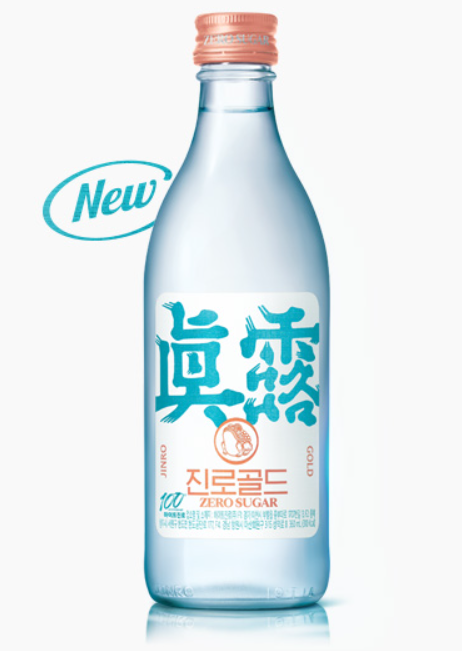 쌀 100% 증류원액 함유와 순한 목넘김의 알코올 도수 15.5도의 진로 골드. 100년의 양조 기술력과 제로슈거를 통해 조화와 균형이 잡힌 부드러운 소주 맛의 황금비율을 구현했다고 해요.