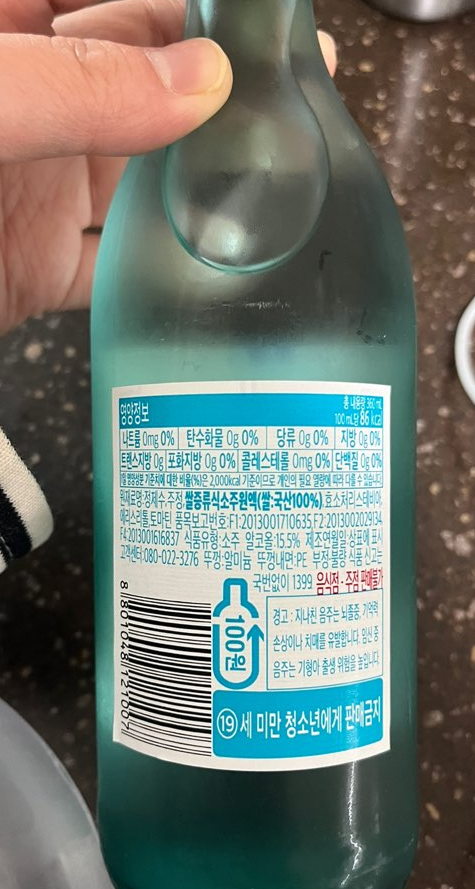 | 원재료 | 정제수, 주정, 쌀증류식 소주원액(쌀:국산 100%), 효소처리 스테비아, 에리스리톨, 토마틴 |