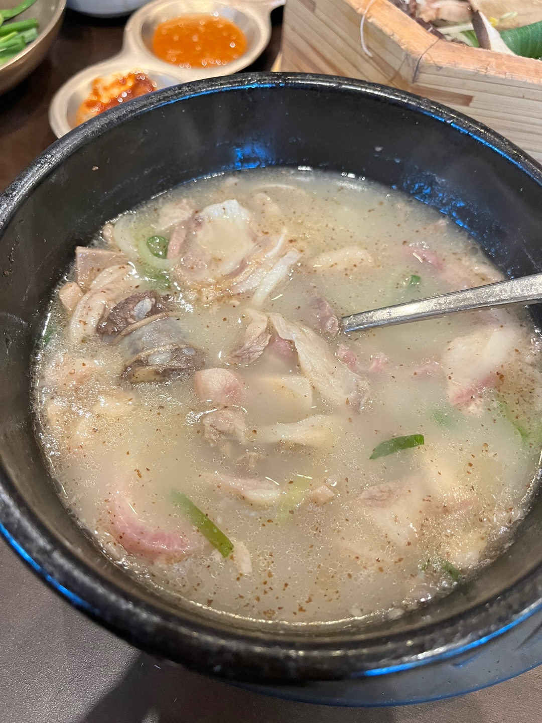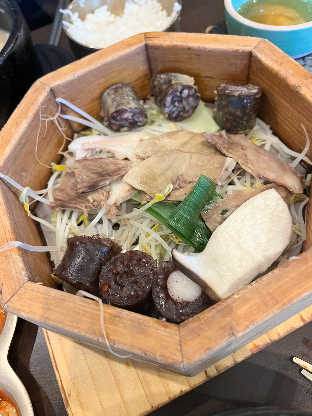 순대국에 맛보기 편백모둠을 추가하면 두 번째 사진처럼 편백찜기에 순대와 수육이 조금 나오는데 맛보기로 충분한 양입니다. 이 또한 바빠서 그런지 숙주와 순대를 던져놓은 듯한 플레이팅은 별로지만 맛은 좋긴 합니다. (다른 분들 후기를 보니 제가 방문한 날이 플레이팅이 좀 별로였던 것 같아요.)