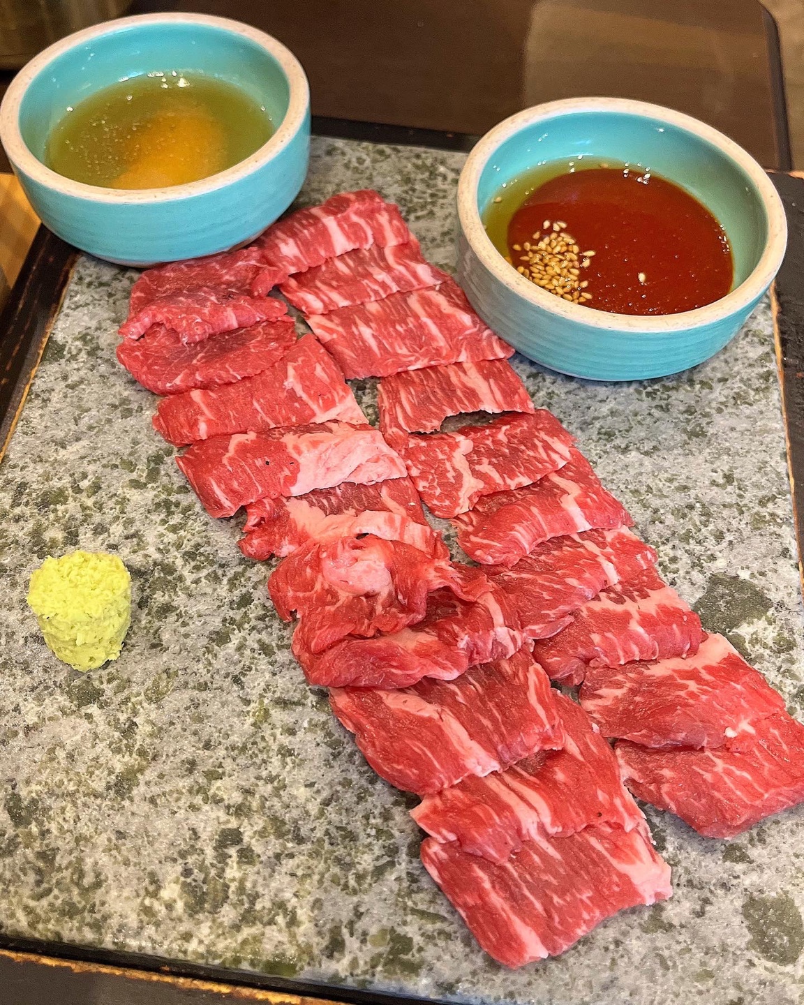 육사시미는 막걸리와 함께 곁들이려고 시켜보았어요. 같은 음식도 여러가지 소스에 찍어먹는 것을 좋아하는 편이라서 참기름장, 초고추장, 고추냉이 세 가지 소스를 주는 것이 좋았어요. 고소하고 맛있긴 한데 고기 질이 그다지 좋지는 않았어요. 가격(9,900원)만큼이라고 생각하시면 될 것 같습니다.