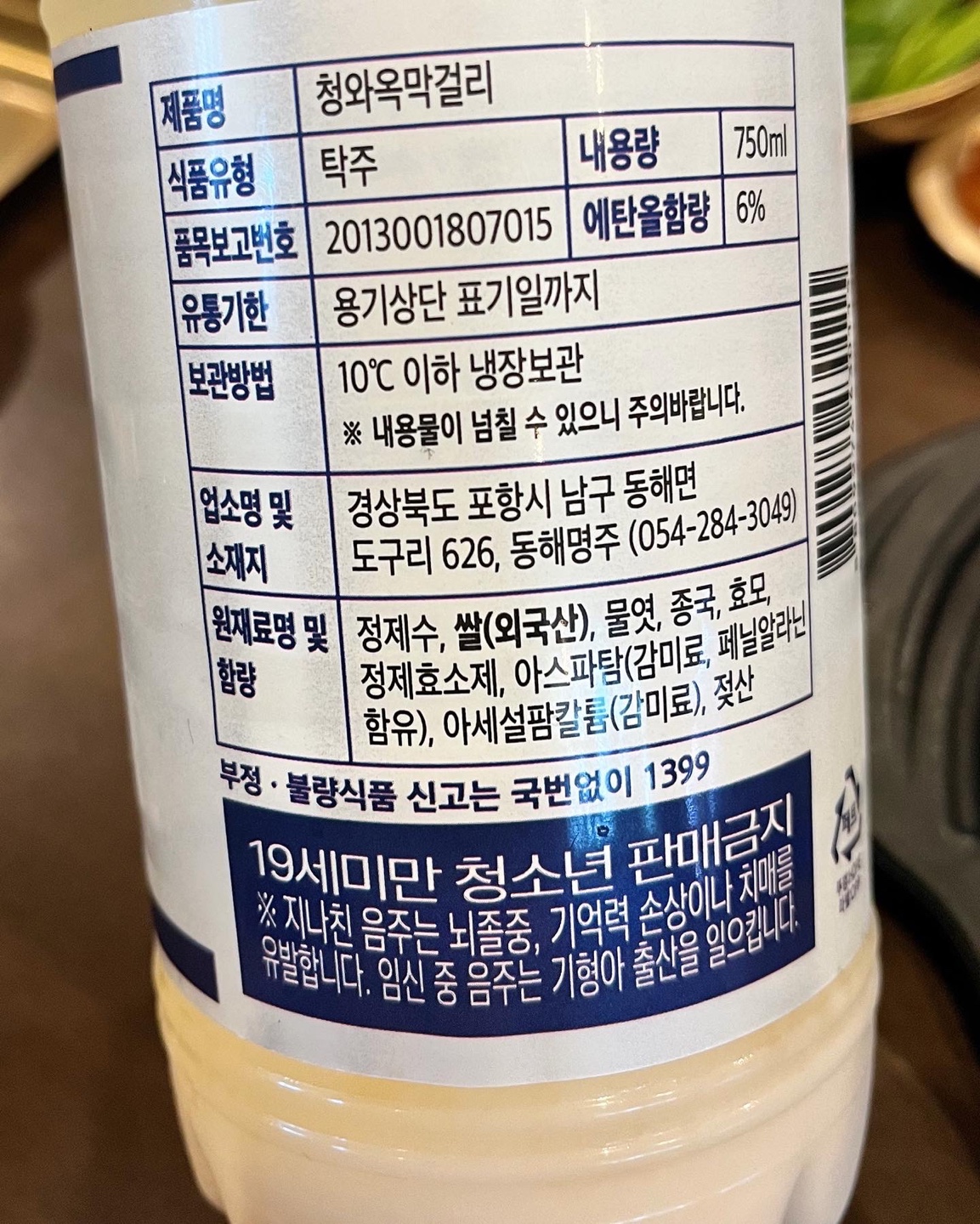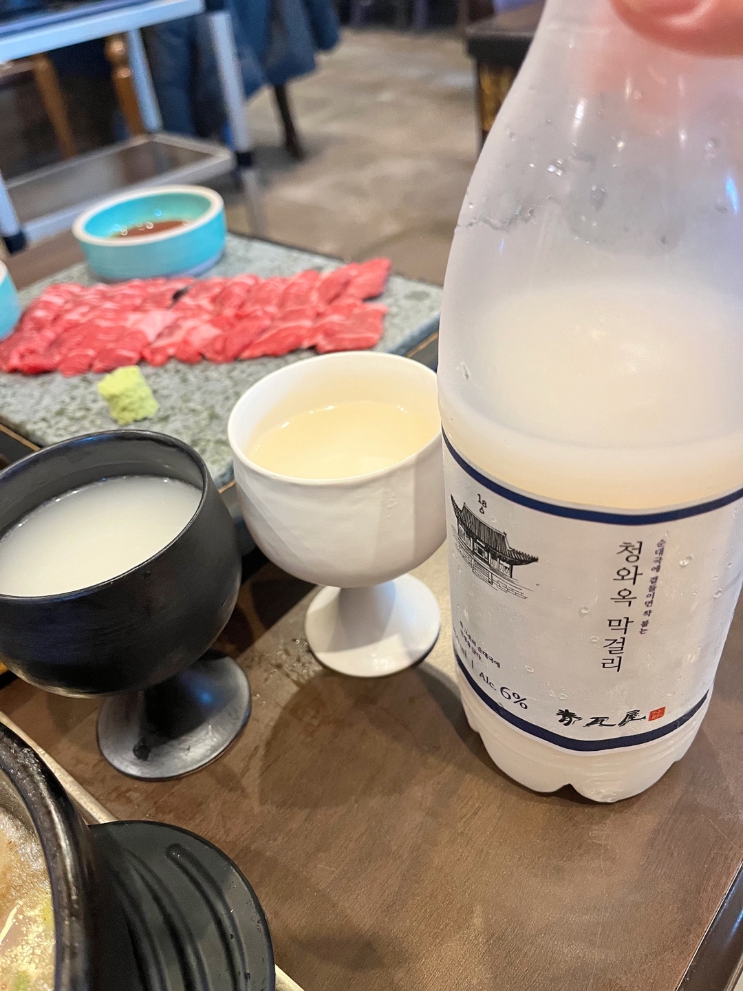 청와옥 막걸리는 포항의 동해명주라는 양조장에서 만들어지며 일반적인 막걸리 스펙인 6도, 750ml입니다. 단맛은 별로 없고 탄산감 있으면서 가벼운 질감의 막걸리예요. 단독으로 마셨을 때는 심심 혹은 슴슴할 수 있겠으나 기름진 순대국밥, 고소한 육사시미랑 정말 잘 어울렸어요.