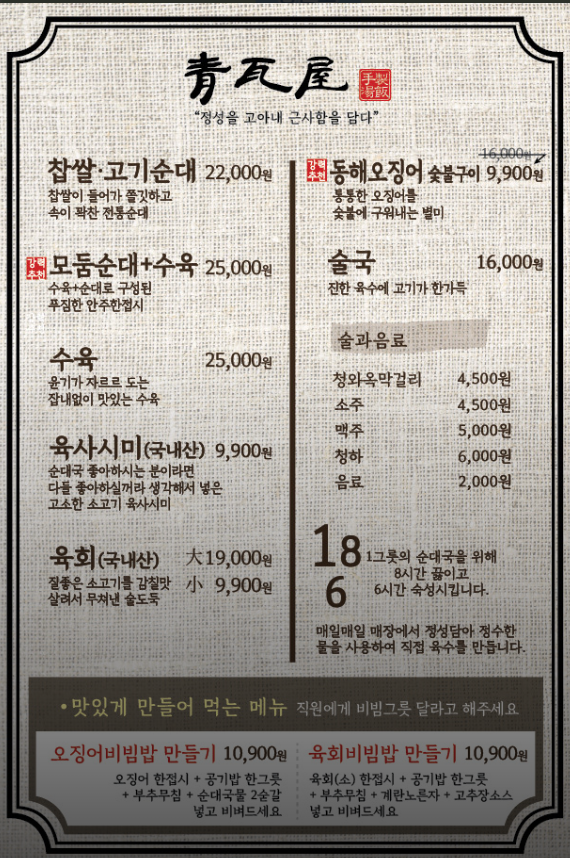 [청와옥 본점] 순대국 육사시미에 청와옥 막걸리 반주
