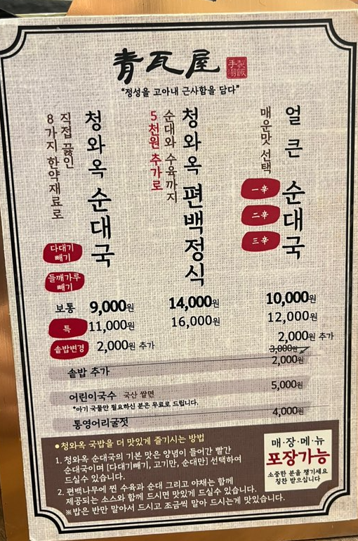 청와옥 순대국은 사이즈가 두 가지 있습니다. 또한 솥밥으로 변경도 가능하고 다대기와 들깨가루를 기호에 따라 선택할 수도 있어요. 편백정식은 국밥과 모둠 순대 수육(맛보기)이 세트로 제공되는 메뉴입니다. 얼큰 순대국은 맵기 조절이 가능해서 좋아요. 어린이들을 위해 국수 메뉴가 있고 국물만 필요하신 분은 무료제공 한다고 해요.