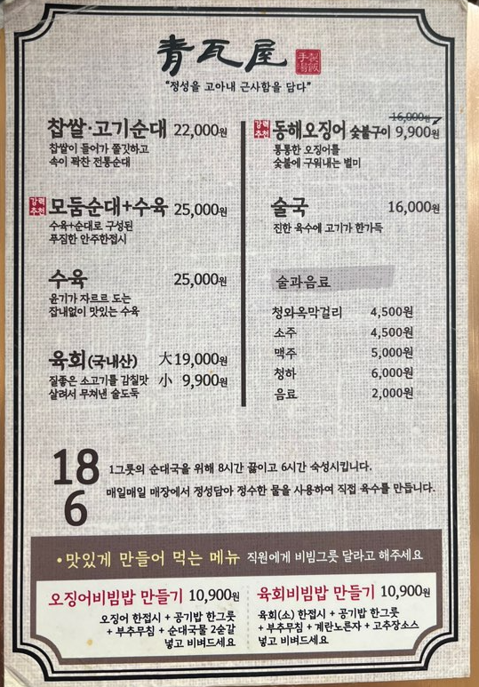 안주하기 좋은 메뉴들이 많은데요. 찹쌀 고기 순대, 모듬 순대 수육, 육회, 동해 오징어 숯불구이, 술국 등이 있어요. 술은 맥주, 소주, 여기서만 판매하는 청와옥 막걸리, 청하가 있습니다.