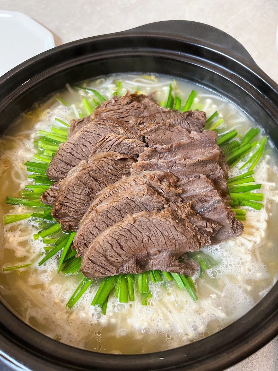 9. 아롱사태를 슬라이스로 얇게 썰어 야채 위에 올려주고 육수를 부어준다. (부족해서 설렁탕 국물 추가)