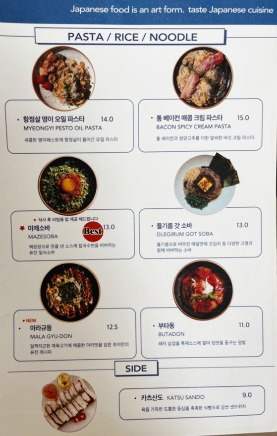 대표메뉴는 후토마끼와 뼈 돈카츠, 연어 냉칼국수, 마제소바입니다. 주류는 하이볼 다섯 종류, 맥주 세 종류가 있으며 음료는 탄산음료와 에이드가 있어요.