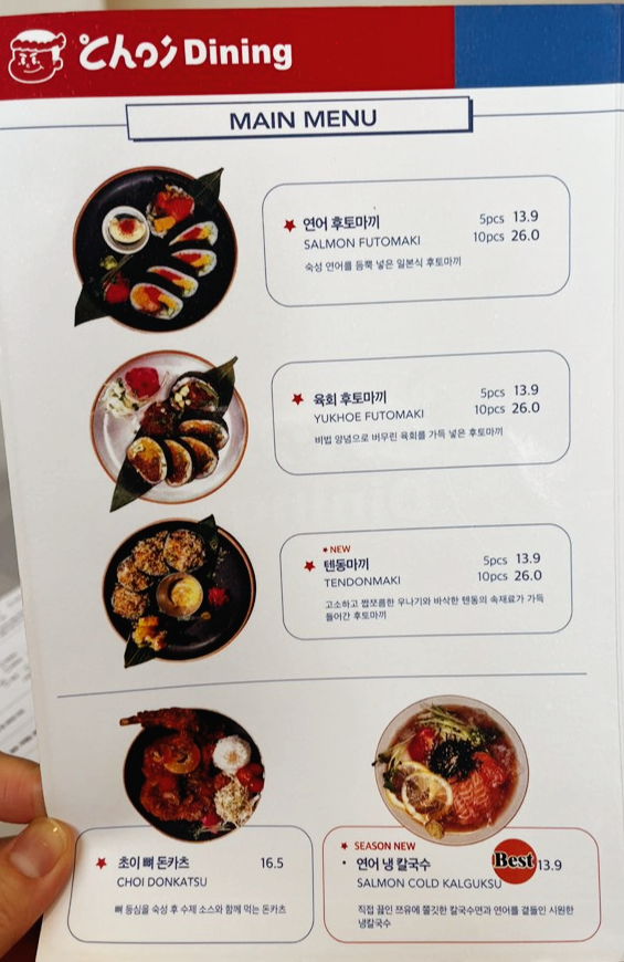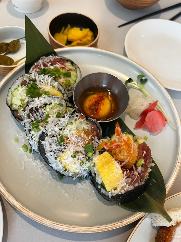 저는 2시 넘어서 방문했기 때문에 빨리 조리되는 메뉴들 위주로 주문을 해 보았습니다. 좌측부터 육회 후토마키 5pcs(13,900원), 연어 냉 칼국수(13,900원), 카츠산도(9,000원) 입니다.