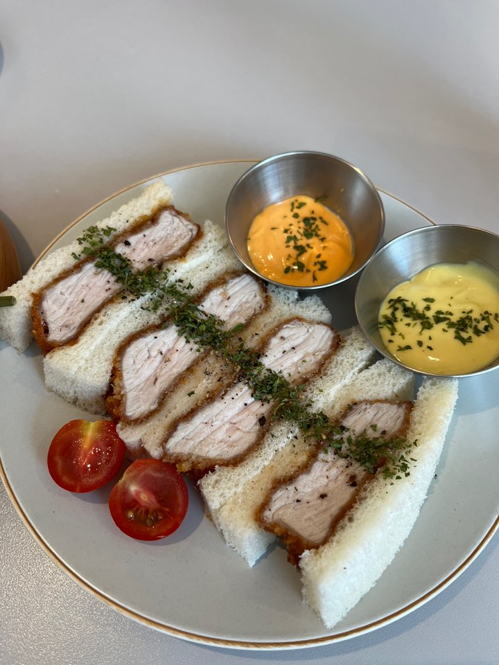 음식은 10분 이내로 빨리 나왔어요. 다시 봐도 먹음직스럽네요. 우동을 별로 좋아하지 않는데 초이다이닝의 연어 냉칼국수는 우동 면발이 정말 쫄깃하고 탱탱해서 맛있더라고요. 더운 날씨 때문에 더 맛있는 것 같기도 해요. 육회 후토마끼는 육회와 계란, 새우튀김이 들어있는 커다란 김밥이예요. 한 입에 먹기 힘든 큰 사이즈라 다섯 피스만 시키길 잘했다는 생각이 들었어요. 카츠산도는 고기 사이즈가 조금 아쉽긴 했는데 촉촉하고 맛있었고 함께 제공되는 소스가 두 가지라서 좋습니다.