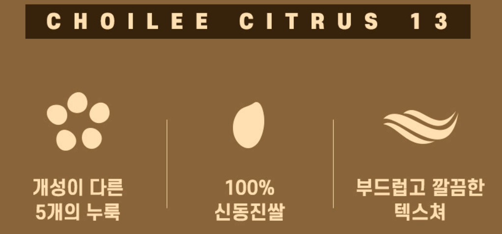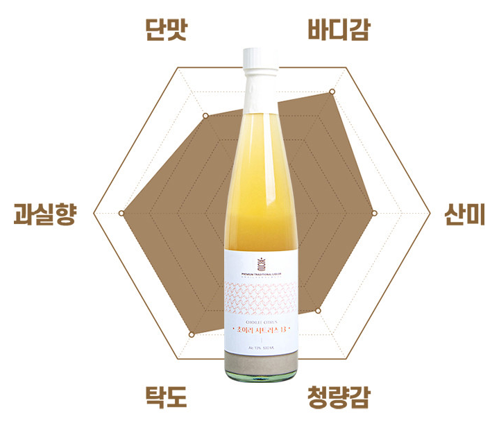 초이리 시트러스는 유자와 감귤이 들어가 시트러스 한 맛이 일품인 프리미엄 탁주이며 100% 신동진쌀을 이용하여 발효부터 숙성까지 100일이라는 시간을 거쳐 완성되는 이양주입니다.