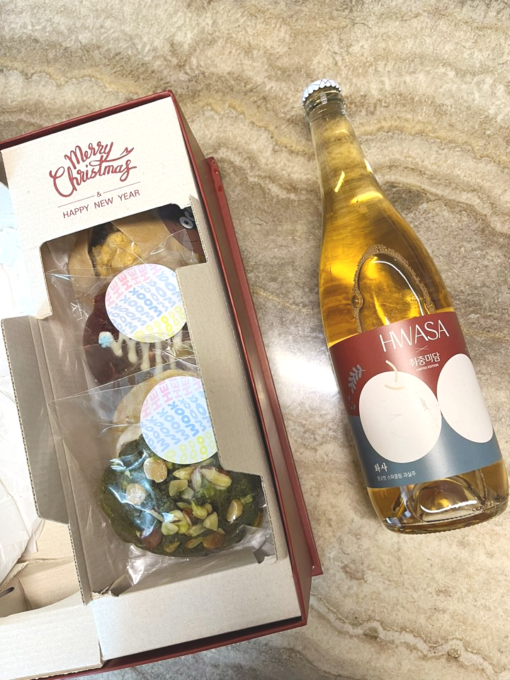 주모로라예요. 오늘은 연말 가족과 함께 파자마 파티를 하며 마셨던 댄싱사이더의 화사 스파클링 과실주와 서울숲 카페거리의 유명한 쿠키점인 구욱희씨의 쿠키를 소개합니다. 취중미담을 필두로 무려 4군데 플랫폼의 합작으로 만들어진 스페셜 에디션 페어링 제품인데요. 자세히 보여드릴게요.