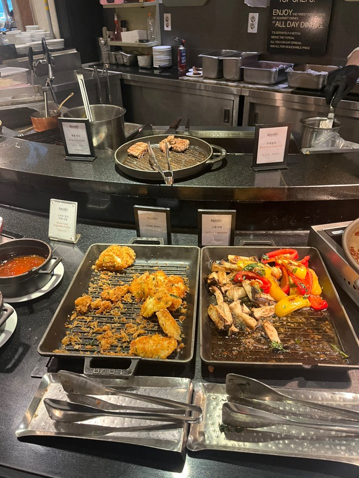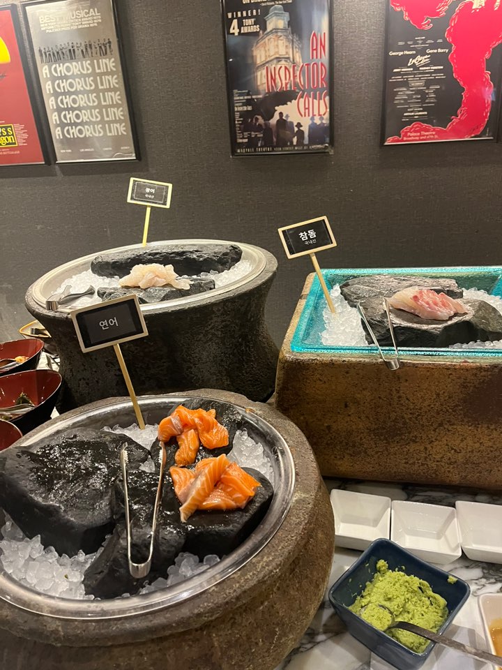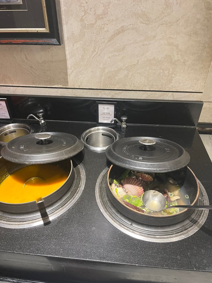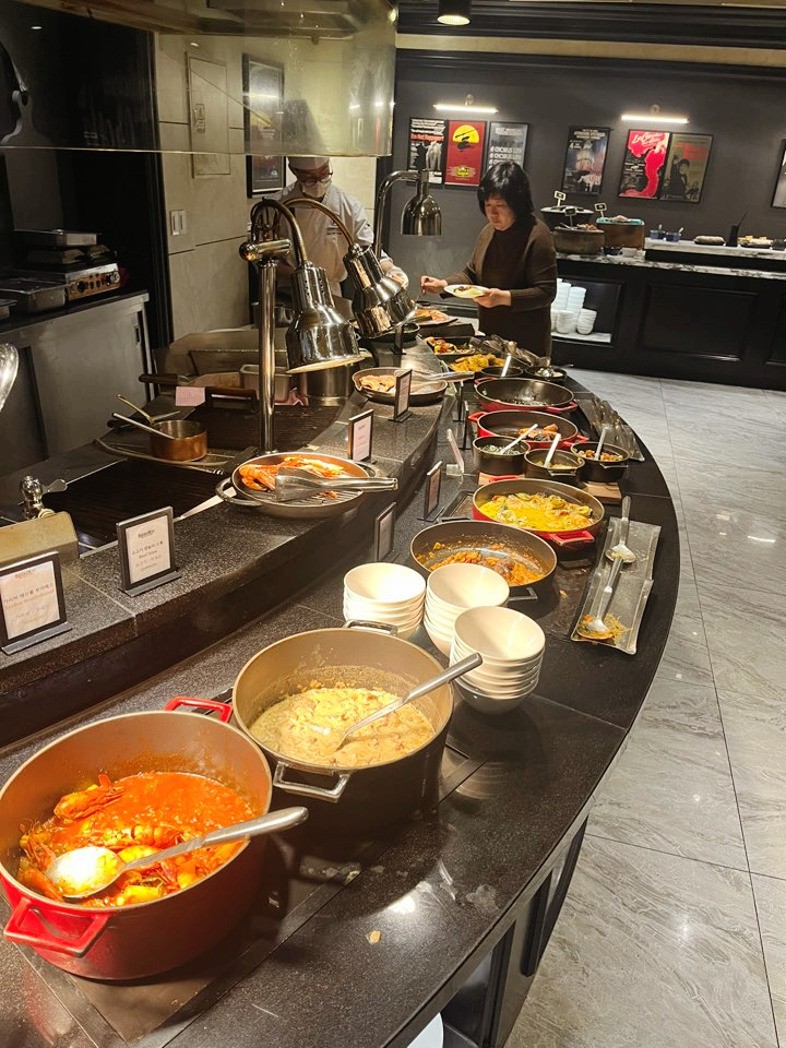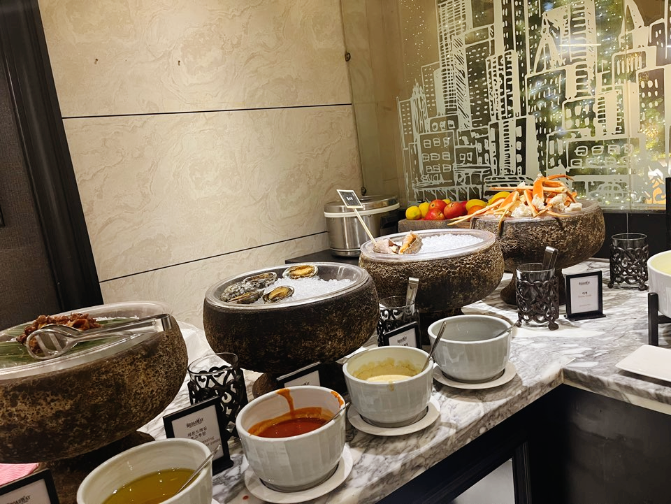 라이브 그릴 스테이크(양고기, 등심, 우대갈비), 활어회, 계절 초밥, 다양한 해산물(대게, 전복, 소라 등), 스프, 치즈류, 바게트, 디저트, 과일, 커피 등. 규모가 타 뷔페에 비해 크지는 않은데 가짓수만 채우는 메뉴 없이 매우 알찬 구성이라 오히려 만족스러웠습니다.