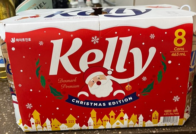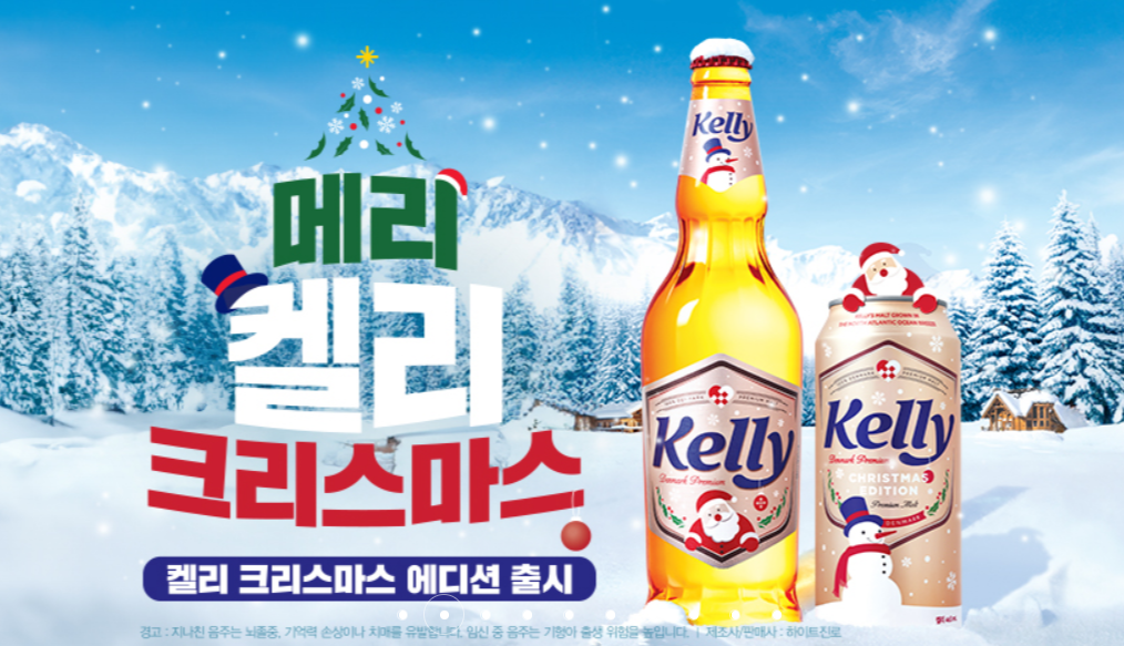 하이트진로에서 크리스마스와 겨울을 상징하는 캐릭터와 북유럽 덴마크 감성을 더한 디자인이 특징인 켈리 크리스마스 에디션을 출시했습니다. 켈리의 맥아 원산지인 덴마크 국기를 오마주한 하트 모양 엠블럼을 적용하고 눈 내리는 배경에 산타클로스와 눈사람 캐릭터를 넣어 연말 분위기를 더했어요.